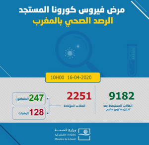 ارتفعت حصيلة الإصابات المؤكدة بفيروس كورونا بالمغرب، إلى 2251، وفق آخر حصيلة أعلنتها وزارة الصحة، إلى غاية الساعة العاشرة من صباح الخميس 16 أبريل.