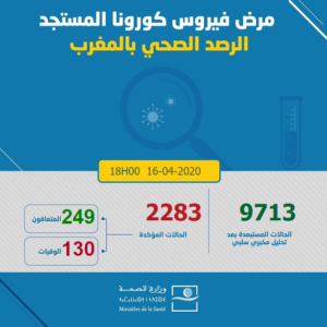 أعلنت وزارة الصحة أنه تم إلى حدود الساعة السادسة من مساء اليوم الخميس 16 أبريل2020، تسجيل 259 حالة إصابة مؤكدة جديدة بفيروس كورونا المستجد، ليرتفع العدد الإجمالي بالمغرب إلى 2283 حالة.