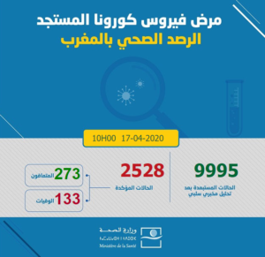 ارتفعت حصيلة الإصابات المؤكدة بفيروس كورونا بالمغرب، إلى 2528، وفق آخر حصيلة أعلنتها وزارة الصحة، إلى غاية الساعة العاشرة من صباح الجمعة 17 أبريل.