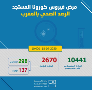 ارتفعت حصيلة الإصابات المؤكدة بفيروس كورونا بالمغرب، إلى 2528، وفق آخر حصيلة أعلنتها وزارة الصحة، إلى غاية الساعة العاشرة من صباح السبت 18 أبريل.