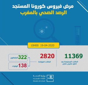 ارتفعت حصيلة الإصابات المؤكدة بفيروس كورونا بالمغرب، إلى 2820، وفق آخر حصيلة أعلنتها وزارة الصحة، إلى غاية الساعة العاشرة من صباح الأحد 19 أبريل.
