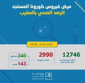 ارتفعت حصيلة الإصابات المؤكدة بفيروس كورونا بالمغرب، إلى 2990، وفق آخر حصيلة أعلنتها وزارة الصحة، إلى غاية الساعة العاشرة من صباح الاثنين 20 أبريل.