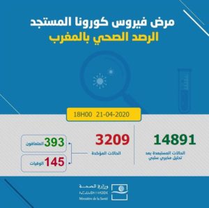 أعلنت وزارة الصحة أنه تم إلى حدود الساعة السادسة من مساء اليوم الثلاثاء 21 أبريل 2020، تسجيل 163 حالة إصابة مؤكدة جديدة بفيروس كورونا المستجد، ليرتفع العدد الإجمالي بالمغرب إلى 3209 حالة.