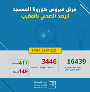 أعلنت وزارة الصحة أنه تم إلى حدود الساعة السادسة من مساء اليوم الأربعاء 22 أبريل 2020، تسجيل 237 حالة إصابة مؤكدة جديدة بفيروس كورونا المستجد، ليرتفع العدد الإجمالي بالمغرب إلى 3446 حالة.
