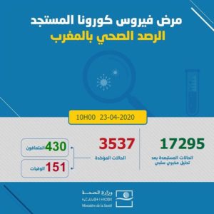 ارتفعت حصيلة الإصابات المؤكدة بفيروس كورونا بالمغرب، إلى 3537، وفق آخر حصيلة أعلنتها وزارة الصحة، إلى غاية الساعة العاشرة من صباح الخميس 23 أبريل2020.