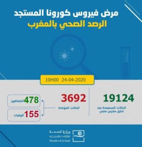 ارتفعت حصيلة الإصابات المؤكدة بفيروس كورونا بالمغرب، إلى 3692، وفق آخر حصيلة أعلنتها وزارة الصحة، إلى غاية الساعة العاشرة من صباح الجمعة 24 أبريل2020.