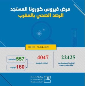 ارتفعت حصيلة الإصابات المؤكدة بفيروس كورونا بالمغرب، إلى 4047، وفق آخر حصيلة أعلنتها وزارة الصحة، إلى غاية الساعة العاشرة من صباح الأحد 26 أبريل2020.