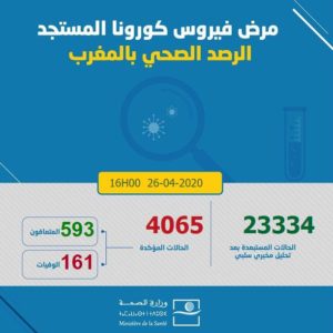 أعلنت وزارة الصحة أنه تم إلى حدود الساعة الرابعة من مساء اليوم الأحد 26 أبريل 2020، تسجيل 168 حالة إصابة مؤكدة جديدة بفيروس كورونا المستجد، ليرتفع العدد الإجمالي بالمغرب إلى 4065 حالة.