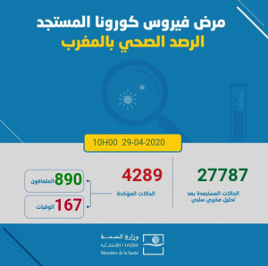 ارتفعت حصيلة الإصابات المؤكدة بفيروس كورونا بالمغرب، إلى 4289، وفق آخر حصيلة أعلنتها وزارة الصحة، إلى غاية الساعة العاشرة من صباح الأربعاء 29 أبريل2020.