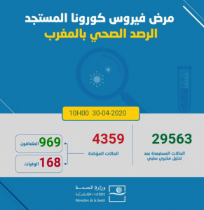 ارتفعت حصيلة الإصابات المؤكدة بفيروس كورونا بالمغرب، إلى 4359، وفق آخر حصيلة أعلنتها وزارة الصحة، إلى غاية الساعة العاشرة من صباح الخميس 30 أبريل2020.