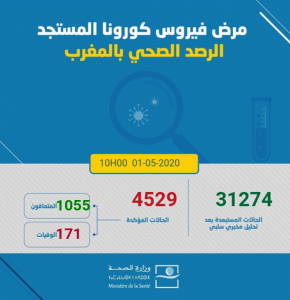 ارتفعت حصيلة الإصابات المؤكدة بفيروس كورونا بالمغرب، إلى 4529، وفق آخر حصيلة أعلنتها وزارة الصحة، إلى غاية الساعة العاشرة من صباح الجمعة 01 ماي 2020.