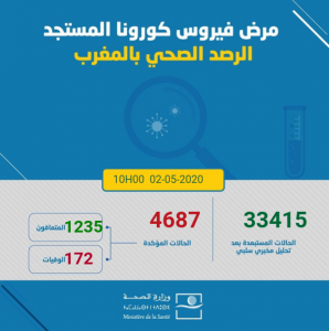 ارتفعت حصيلة الإصابات المؤكدة بفيروس كورونا بالمغرب، إلى 4687، وفق آخر حصيلة أعلنتها وزارة الصحة، إلى غاية الساعة العاشرة من صباح السبت 02 ماي 2020.