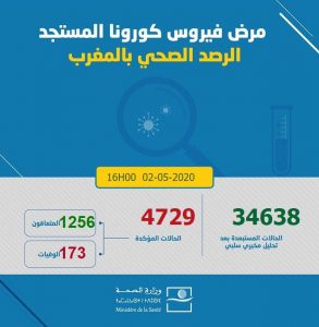 أعلنت وزارة الصحة أنه تم إلى حدود الساعة الرابعة من مساء اليوم السبت 02 ماي 2020، تسجيل 160 حالة إصابة مؤكدة جديدة بفيروس كورونا المستجد، ليرتفع العدد الإجمالي بالمغرب إلى 4729 حالة.