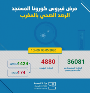 ارتفعت حصيلة الإصابات المؤكدة بفيروس كورونا بالمغرب، إلى ،4880 وفق آخر حصيلة أعلنتها وزارة الصحة، إلى غاية الساعة العاشرة من صباح الأحد 03 ماي 2020.