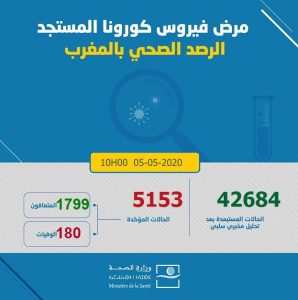 ارتفعت حصيلة الإصابات المؤكدة بفيروس كورونا بالمغرب، إلى ،5153 وفق آخر حصيلة أعلنتها وزارة الصحة، إلى غاية الساعة العاشرة من صباح الثلاثاء 05 ماي 2020.