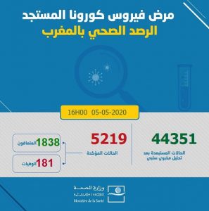 أعلنت وزارة الصحة أنه تم إلى حدود الساعة الرابعة من مساء اليوم الثلاثاء 05 ماي 2020، تسجيل 166 حالة إصابة مؤكدة جديدة بفيروس كورونا المستجد، ليرتفع العدد الإجمالي بالمغرب إلى 5219 حالة.