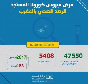أعلنت وزارة الصحة أنه تم إلى حدود الساعة الرابعة من مساء اليوم الأربعاء 06 ماي 2020، تسجيل 189 حالة إصابة مؤكدة جديدة بفيروس كورونا المستجد، ليرتفع العدد الإجمالي بالمغرب إلى 5408 حالة.