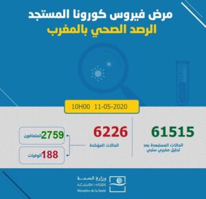 ارتفعت حصيلة الإصابات المؤكدة بفيروس كورونا بالمغرب، إلى ،6226 وفق آخر حصيلة أعلنتها وزارة الصحة، إلى غاية الساعة العاشرة من صباح الإثنين 11 ماي 2020.