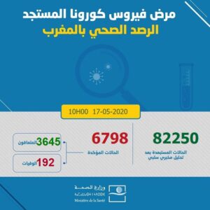 ارتفعت حصيلة الإصابات المؤكدة بفيروس كورونا بالمغرب، إلى ،6798 وفق آخر حصيلة أعلنتها وزارة الصحة، إلى غاية الساعة العاشرة من صباح الأحد 17 ماي 2020.