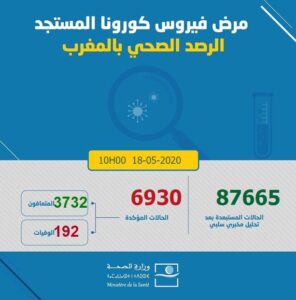 ارتفعت حصيلة الإصابات المؤكدة بفيروس كورونا بالمغرب، إلى ،6930 وفق آخر حصيلة أعلنتها وزارة الصحة، إلى غاية الساعة العاشرة من صباح الإثنين 18 ماي 2020.