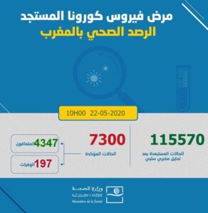 ارتفعت حصيلة الإصابات المؤكدة بفيروس كورونا بالمغرب، إلى ،7300 وفق آخر حصيلة أعلنتها وزارة الصحة، إلى غاية الساعة العاشرة من صباح الجمعة 22 ماي.