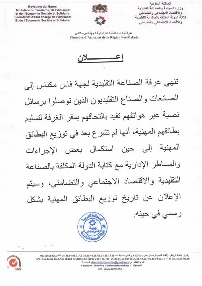 وفي توضيح رسمي، أكدت غرفة الصناعة التقليدية لجهة فاس–مكناس أن عملية توزيع البطاقات المهنية لم تنطلق بعد، موضحة أن الأمر مرتبط باستكمال بعض الإجراءات والمساطر الإدارية الجارية مع كتابة الدولة المكلفة بالصناعة التقليدية والاقتصاد الاجتماعي والتضامني.