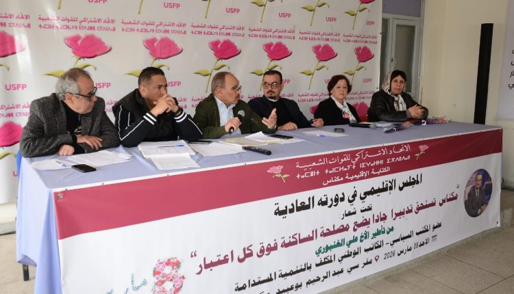 عقد المجلس الإقليمي لحزب الاتحاد الاشتراكي للقوات الشعبية بمكناس اجتماعه يوم الأحد 8 مارس 2026، تزامنا مع اليوم العالمي للمرأة، تحت إشراف عضو المكتب السياسي علي الغنبوري وبحضور قيادات ومناضلي الحزب بالإقليم.