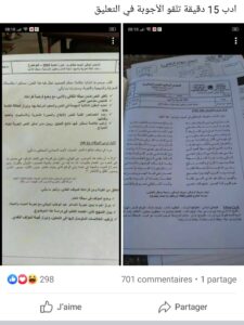 رصد ناشطو مواقع التواصل الاجتماعي، اليوم الجمعة، قيام مجموعة فيسبوكية تحمل اسم “تسريبات باك 2020″، بنشر أوراق امتحان اللغة العربية الخاصة بنيل شهادة الباكالوريا، وذلك بعد دقائق فقط من انطلاق الامتحان، وهو ما جعل المئات من النشطاء يتفاعلون بصدمة كبيرة مع هذا السلوك الخارج عن القانون ويعاقب عليه بشدة.